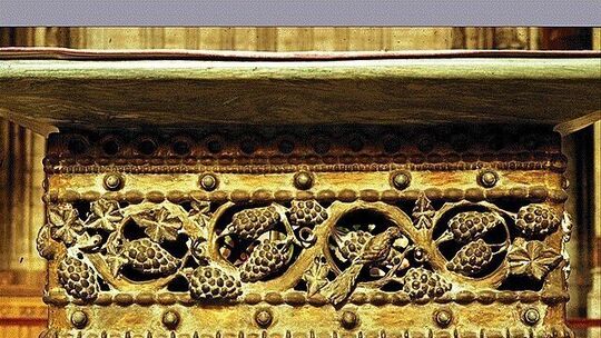Der kubische Unterbau des Altares besteht aus gegossenen Bronzeplatten, die im oberen Drittel von einer wellenförmigen Weinlaubranke durchbrochen sind, in die Trauben und Vögel eingefügt sind.