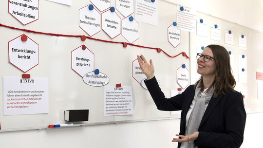 Im Seminarraum ist immer der rote Ausbildungsfaden präsent. Er zeigt, welchen Weg die Lehramtsanwärter zu gehen haben, bis sie fertig ausgebildete Lehrkräfte sind.