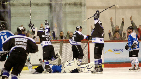 Der EHC Neuwied, Marc Blumenhofen, Philipp Büermann, Jens Hergt (von links) jubelt, doch der Treffer von Andreas Wichterich (nicht im Bild) in der 13. Minute zählt nicht. Blumenhofen soll den ESC-Torhüter Ilja Doroschenko (am Boden) kurz vorher behindert haben und kassiert dafür eine Zwei-Minuten-Strafzeit. Foto: Jörg Niebergall