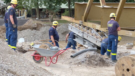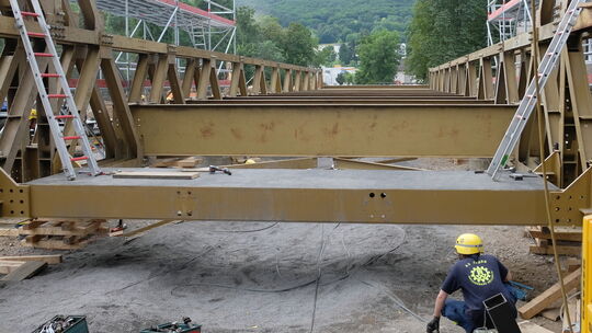 In Bad Neuenahr ist ein zwischen 70 und 120 Mann starker Trupp des Technischen Hilfswerks seit einigen Tagen dabei, eine Behelfsbrücke im Verlauf der Landgrafenstraße zu errichten. Nach dem die abgesackte Landgrafenbrücke am vergangenen Wochenende komplett abgerissen wurde, waren die THW-Helfer am Montag dabei, das erste Brückenteil über den Fluss zu schieben. Ihre provisorische Zentrale haben die Brückenbauer im Foyer der Kliniken Bad Neuenahr eingerichtet, die im Untergeschoss ebenfalls von den Ahrfluten überschwemmt worden waren. Die Brücke soll eine Spannweite von 51 Metern bekommen. Nach Angaben der THW-Helfer ist derzeit geplant, dass am Sonntag die Asphaltarbeiten der Brückenfahrbahn erfolgen sollen, sodass diese Verbindung ab der kommenden Woche genutzt werden könnte. Die Ahrbrücke im Verlauf der L 83 ist weiterhin voll gesperrt, aber die Piusbrücke etwas ahraufwärts ist inzwischen wieder offiziell befahrbar – natürlich nur für Anwohner und Hilfskräfte.