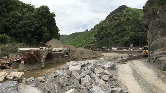 Kurz hinter Walporzheim im Bereich der „Bunten Kuh“ ist dann endgültig Schluss. Dort war in der Flutnacht nicht nur die Bahnbrücke über die Ahr fortgerissen worden, sondern auch die komplette Fahrbahn der B 267 zwischen dem Fluss und der steilen Felswand. Am Montag versuchten Helfer mit schweren Baufahrzeugen, eine provisorische Fahrbahn zu errichten und die Marienthaler Straße so wenigstens teilweise wieder befahrbar zu machen.