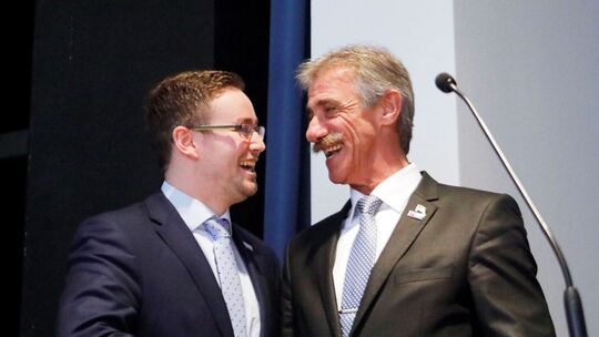 AfD-Landesvorsitzender Uwe Junge (rechts) gratuliert dem frisch gewählten AfD-Spitzenkandidaten für die Bundestagswahl 2017, Sebastian Münzenmaier, auf der Bühne in Bingen.