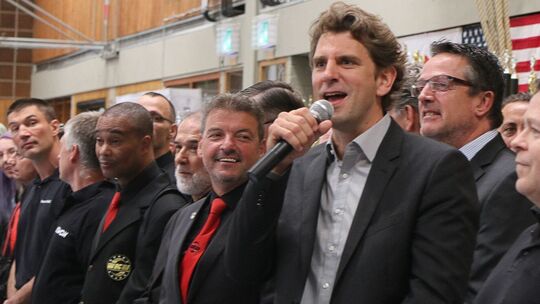 „Let's get ready to rumble“: Wie „Ansager-Legende“ Michael Buffer heizte Landrat Marlon Bröhr den mehr als 1000 Kämpfern beim 31. Battle of the Hunsrück mit seiner Eröffnungsrede ein. Dass Bröhr kam, freute vor allem Organisator Harald Neusser (links neben Bröhr) vom Shodan Gym. Wolfgang Schmidt