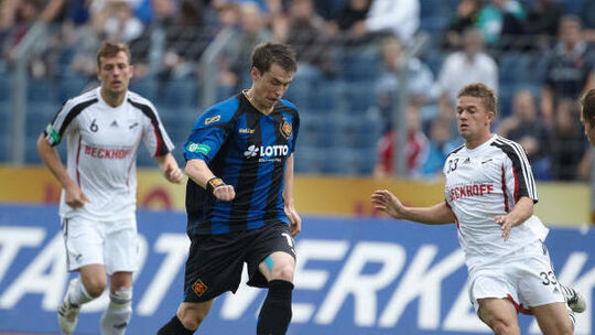 Philipp Langen (am Ball) mühte sich gegen Verl auf der linken Mittelfeldseite der TuS. Leistungsmäßig gibt's da sicherlich noch Luft nach oben, zumal sich der 25-Jährige selbst noch nicht als "100-prozentig fit" einstuft. Außerdem sieht der Koblenzer Kicker in diesen Tagen Vaterfreuden entgegen. Ob das beflügelt? Foto: Thomas Frey