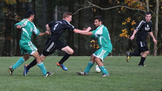 Schlusslicht SG Hunsrückhöhe (in Grün, von links mit Lulzim Krasnici und Stefan Ströher) konnte den neuen Tabellenführer TuS Rheinböllen II um Libero Dennis Flesch (links) und den vierfachen Torschützen Florian Bauermann (rechts) nicht stoppen und ging nach einer schwachen Leistung vor dem eigenen Publikum in Belg mit 1:6 unter. Foto: B&P Schmitt
