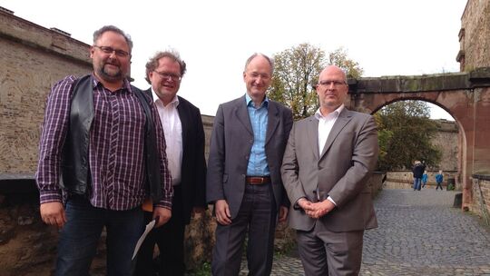 Die Köpfe hinter der Burgenblogger-Idee (von rechts): Rainer Zeimentz, Vorstand Entwicklungsagentur Rheinland-Pfalz, RZ-Chefredakteur Christian Lindner, Generaldirektor Thomas Metz und der Burgherr, Verwalter Klaus Collerius.