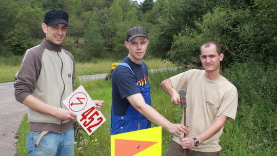 Der Nachwuchs des Sportfahrerteams Hunsrück in Aktion. Florian Lofi, Thomas Conradt und Michael Wilke bauen die WP auf. Foto: Joachim Hähn