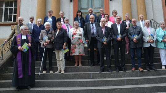 Nach dem feierlichen Gottesdienst trafen sich die Jubiläumskonfirmanden auf der großen Treppe des Winterburger Gotteshauses zu einem Erinnerungsfoto gemeinsam mit Pfarrer Christof Weires. Foto: Reinhard Koch khr