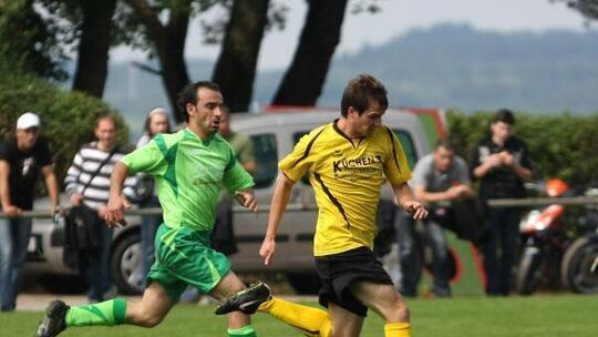 Die A-Klasse nimmt am ersten Spieltag direkt Fahrt auf - genau wie hier Unzenbergs Torjäger Daniel Georg im Duell mit einem weiteren ehemaligen Bezirksliga-Kicker. Bilal Özberks SG Ehrbachtal startet am Sonntag bei der SG Masburg. Georgs Unzenberger haben es nicht weit: Sie fahren zum Derby nach Sohren. Dort setzte es vor drei Wochen im Finale des VG-Pokals ein 1:4 für Unzenberg gegen die SGS. Foto: Verena Schmidt