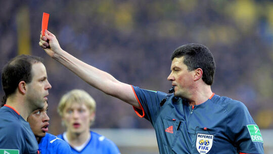 Herbert Fandel während seiner aktiven Schiedsrichter-Laufbahn: Damals muss seine Vorliebe für unnatürliche Handbewegungen und die Vergrößerung der Körperfläche entstanden sein. Foto: dpa