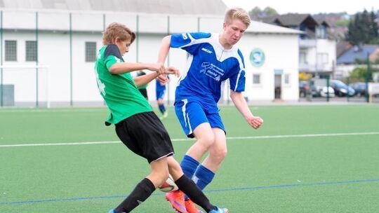 Der Diezer Luis Back und Philipp Mäurer von der JSG Hahnstätten (rechts) versuchen, diesen Zweikampf zu ihren Gunsten zu entscheiden. Letztlich waren die Kombinierten aus Hahnstätten und Umgebung aggressiver und hatten damit die Basis für den ersten Saison-Dreier gelegt. Foto: Andreas Hergenhahn