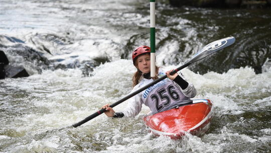Im Stangenwald auf der wilden Nahe erfolgreich unterwegs: Jana-Elisa Bartsch vom gastgebenden RKV sicherte sich beim Herbstslalom gleich drei Rheinland-Pfalz-Titel. Foto: Klaus Castor