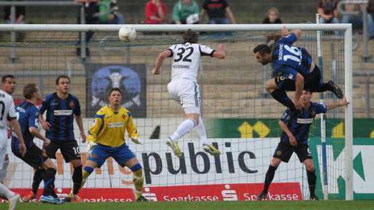 Der fliegende Bosnier: Hier klärt TuS-Defensivmann Murat Sejdovic (rechts) spektakulär im eigenen Strafraum vor dem einköpfbereiten Elversberger Lukas Billick. Bei einer vergleichbaren Situation traf der Koblenzer den Ball allerdings mit der Hand - und verursachte dadurch schon den vierten Strafstoß in diesem Jahr gegen seine Mannschaft.