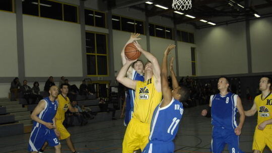 Viele Arme, ein Ziel: VfLer Clemens Merk (gelbes Trikot) peilt den Korb an. Vier Punkte erzielte er im Duell gegen den MTV Kronberg. Foto: Klaus Castor