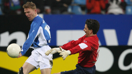 In der Zweiten Liga stand Peter Eich während seiner Karriere 233 Mal auf dem Platz, er spielte für Waldhof Mannheim, den FC Homburg und den 1. FC Saarbrücken. Hier ist der Bochumer Joris van Hout im Jahr 2006 sein Gegner. picture-alliance