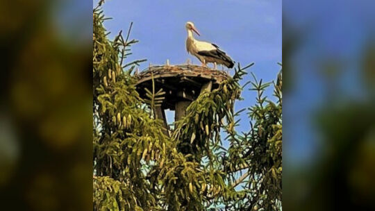 Welch eine Freude, als vor ein paar Tagen ein Storch in dem vorbereiteten Nest auf einer hohen Tanne im Garten bei Familie Kehl in Limbach zum ersten Mal landete. Ein weiterer Storch ließ sich gleichzeitig auf dem Scheunendach nieder. Durch ihr werbendes Klappern machten sie auf sich aufmerksam.