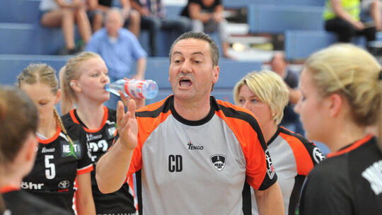 Trainer Caslav Dincic schwört seine Vulkan-Ladies ein. Beim Auswärtssieg in Kirchhof war der serbische Coach einen Tag nach seinem 55. Geburtstag noch nicht mit allem zufrieden. Doch das Ergebnis stimmte, der Erstliga-Absteiger ist auf Kurs. Foto: Andreas Walz