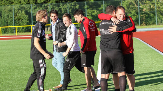 Erleichterung pur bei der SG Zell/Bullay/Alf und ihren Interimstrainern Sascha Schmitz (Dritter von rechts) und Özgür Akin (Zweiter von rechts) nach dem Abpfiff gegen die SG Osburg: Zell zitterte sich zum 2:1-Sieg und bleibt damit in der Bezirksliga West. Foto: Alfons Benz