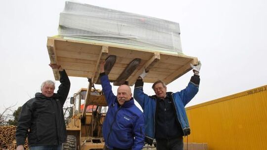 Die Schreinerwerkstatt wird verladen. Von links: Udo Mechlinski, Franz Kemler und Reinhard Schlauwitz verladen eine Formatkreissäge.