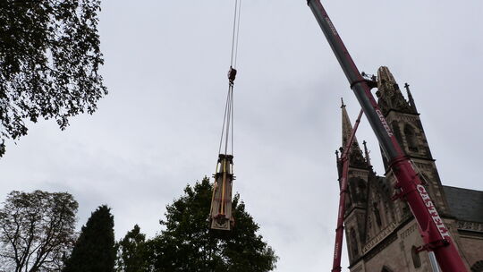 Bilder: Kreis AhrweilerEiner der Turmhelme der Apollinariskirche in Remagen wurde abgenommenam 25.09.2025