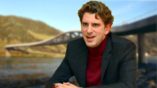 Landrat Marlon Bröhr vor der gedachten Mittelrheinbrücke (Fotomontage)