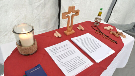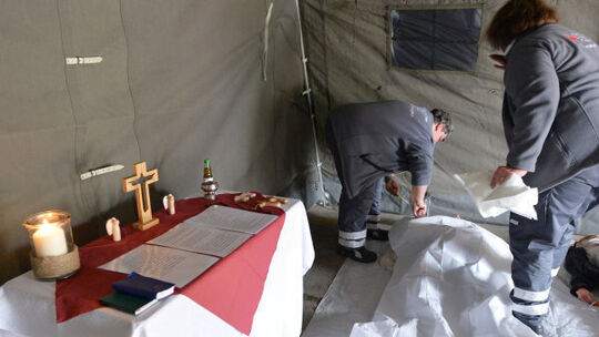 Wenn jede Hilfe zu spät kommt, steht Zelt „X“ bereit – für die Toten. Dort ist ein kleiner Altar aufgebaut, darauf liegen Texte für Christen, Juden und Muslime. So könnte eine Katastrophe aussehen – doch vorerst trainieren die Einsatzkräfte den Ernstfall. Das Szenario: eine Explosion in einer Düngemittelfabrik mit 120 Verletzten.