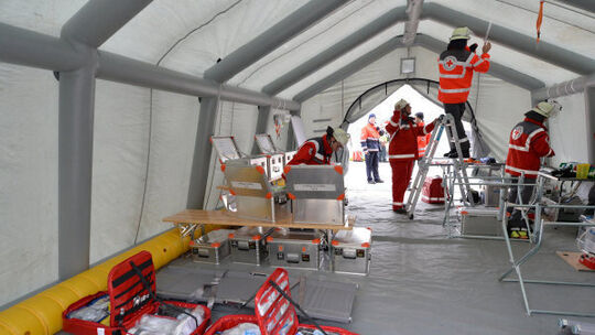 Rettungskräfte bauen bei der Notfallübung "Flinker Oktopus" auf dem Truppenübungsplatz Lehnin bei Brück (Brandenburg) das Behandlungszentrum auf.