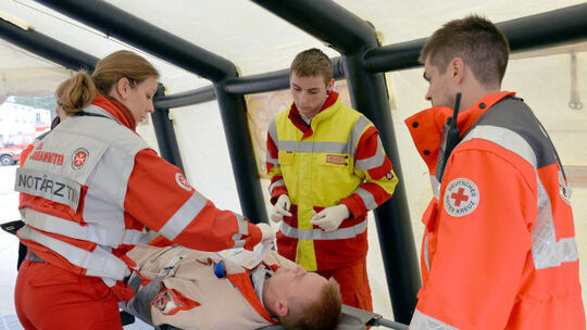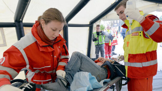 Blutende Menschen werden auf fahrbaren Liegen herbeigerollt, in Minutenschnelle untersucht und auf große, graue Zelte verteilt. Dort versorgen Ärzte die Opfer je nach Schwere der Verletzungen und bereiten sie auf den Weitertransport in Kliniken vor. Martinshörner ertönen. Ein Hubschrauber kreist.