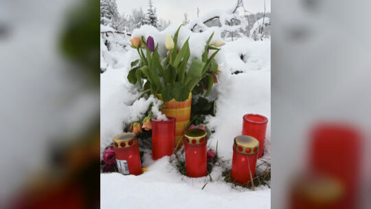 Unbekannte haben am Fundort der getöteten zwölfjährigen Luise in Freudenberg Blumen in den frisch gefallenen Schnee gelegt. Das Mädchen starb an den Folgen zahlreicher Messerstiche. Foto: Roberto Pfeil/dpa