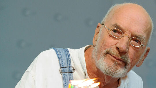 Peter Lustig mit einer Torte zur 100. Folge von Löwenzahn. Da darf jetzt auch das Geburtstagslied laufen.