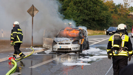 Ein Auto brennt am Donnerstagabend auf der B262 bei Mayen. Die Insassen konnten sich laut Polizei rechtzeitig aus dem Wagen retten.