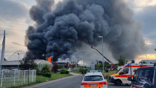 Rettungskräfte bekämpfen an Pfingstsamstag den Brand in einer Firmenhalle in Kottenheim. --/Winkler TV /dpa