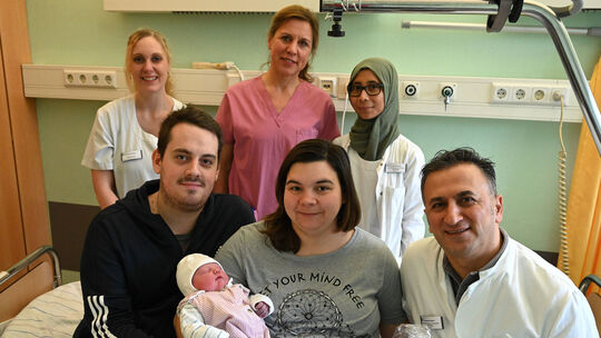 Das Bild zeigt Kinderkrankenpflegerin Patrizia Amrehn, Hebamme Annette, Thelen und Assistenzärztin Noor Afriani (Hinten von links). In der ersten Reihe (von links): André Münzel, Denise Wetter mit Milan Münzel und Chefarzt Ilhan Saka. mbo Foto: Andreas Waltz