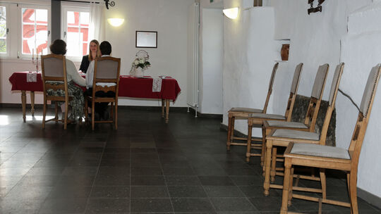 Das Foto von der Trauung von Katja (geborene Jonas) und Michael Thomas im Viergiebelhaus wurde vor der Zeremonie im Viergiebelhaus in Monreal „gestellt“. Ein Fotograf durfte bei der standesamtlichen Hochzeit (ebenso wie andere Gäste) nicht zu gegen sein. Die große Hochzeitsfeier wird in Verbindung mit der Taufe ihres Nachwuchses nachgeholt. Im Gegensatz zu manch anderen Heiratswilligen hatten Katja und Michael Thomas ihren Hochzeitstermin wegen der Corona-Krise nicht nach hinten verschoben. Elvira Bell