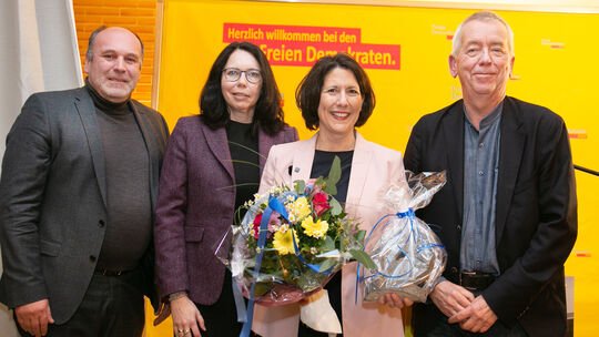 Sie strahlen trotz schlechter Umfragewerte Zuversicht aus: (von links) der Parlamentarische Geschäftsführer der FDP-Landtagsfraktion, Marco Weber, die FDP-Stadtverbandsvorsitzende Stephanie Preil, Ministerin Daniela Schmitt und der FDP-Fraktionschef im Stadtrat und im Kreistag, Ekkehard Raab. Rico Rossival