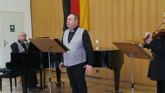 Die Musiker Kantor Juri Zemski (Gesang), Alexander Goldenberg (Klavier) und Faiq (Geige) zeigten mit ihrer musikalischen Darbietung auch ein Zeichen der Solidarität mit allen Juden. Foto: Brigitte Meier Brigitte Meier