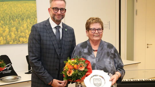 Hiltrud Surges steht die Freude ins Gesicht geschrieben: Sie wurde mit dem kleinen Wappenteller für ihr gesellschaftliches Engagement im Kreis Mayen-Koblenz geehrt und lud sogleich den Landrat Marko Boos zum vorweihnachtlichen Feuerzauber in Mendig ein. Der sagte zu. Winfried Scholz