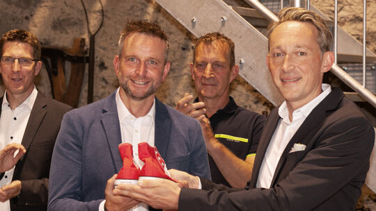 Siebenmeilenstiefel sind es zwar nicht gerade, die Marko Boos (2. von links) ins Kreishaus tragen sollen, aber SPD-Kreischef Marc Ruland (rechts) übergibt diejenigen Sportschuhe, mit denen Christoph Mohr 2020 als SPD-Mann ins Stadtbürgermeisteramt von Bendorf gelaufen ist. Foto: Rico Rossival Michael Kuttler. Rico Rossival