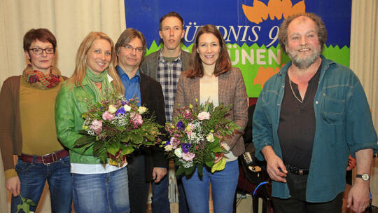 Natascha Lentes (2. von links) und Anne Spiegel (2. von rechts) waren die Ehrengäste beim Neujahrsempfang der Mendiger Grünen. Sie wurden von (von links) Ivette Mittler, Konrad Böhnlein, Stephan Retterath und Leo Heinen begrüßt. Foto: Elvira Bell