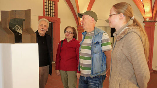 Alle Jahre wieder treffen sich Kunstinteressierte beim Michelsmarkt der Künste im Historischen Rathaus, um sich die Arbeiten der ausstellenden Künstler anzusehen und so wie auf dem Foto mit Fred Schäfer-Schällhammer ins Gespräch zu kommen. Foto: Elvira Bell