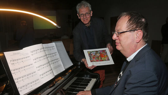 Begrüßt wurden die Besucher eingangs von Jürgen Gundalin. Der evangelische Pfarrer ging in seiner Ansprache auf Karsten Mittags künstlerisches Schaffen ein. Beim Hören der Klänge und Rhythmen halte der Künstler demnach unmittelbar fest, was diese in ihm auslösen.