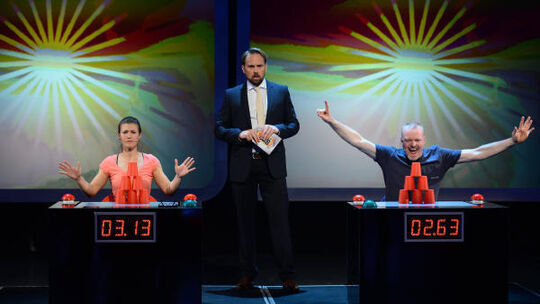 Die Entscheidung im zwölften Spiel: Stefan Raab (rechts) schafft es schneller als Caroline Gessner, aus Plastikbechern Türme zu bauen.