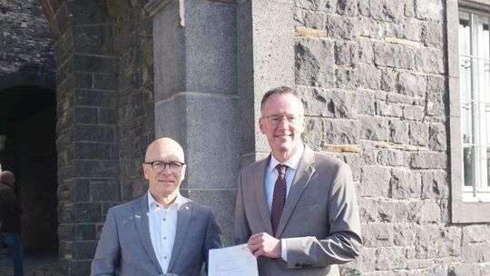 Den ersten Förderbescheid für die Sanierung der Genovevaburg erhielt OB Dirk Meid (links) von Innenminister Michael Ebling. Foto: Jacqueline Blang/Stadt Stadtverwaltung Mayen
