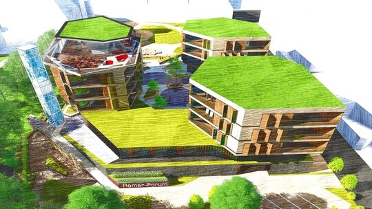 Das künftige Römer-Forum als Skizze: In den Turm mit dem Panoramarestaurant (links) soll ein Hotel mit 40 Zimmern entstehen. Foto: Rahmig Architektur Rahmig Architekt