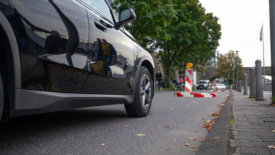 Fahrbahn verengt: Am Koblenzer Moselufer gilt nun Tempo 30 zwischen Alter Burg (Höhe Balduinbrücke) und Kastorpfaffenstraße/Kreisverkehr Rheinstraße. Als begleitende Maßnahme wurden Hindernisse aufgebaut, um den Verkehr zu verlangsamen. Alexej Zepik