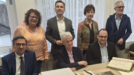 Neben Vertretern des Landeshauptarchivs und der Stiftung Görres-Gymnasium freuen sich auch Schulleiterin Ute Mittelberg (stehend, 2. von rechts) und Oberbürgermeister David Langner (stehend, 2. von links) über die Übersiedlung des Schularchivs. Alexander Thieme-Garmann