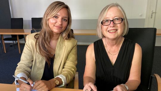 Ihnen gefällt, was sie tun, und sie scheinen die Richtigen für den Job als Beschäftigungspilotin zu sein: Iryna Zimmermann (links) und Milada Holman beraten ukrainische Geflüchtete, damit sie den Weg in den Arbeitsmarkt finden. Dabei arbeiten sie eng mit anderen Stellen zusammen. Foto: Katrin Steinert Katrin Steinert