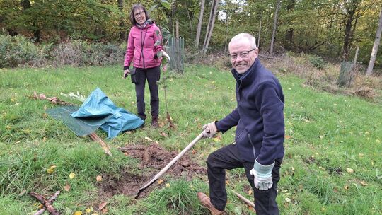 Beate und Ulrich Mandel macht die Arbeit im Wald sichtlich Freude: Sie pflanzen eine Sommerlinde für ihren 40. Hochzeitstag. Alexander Thieme-Garmann