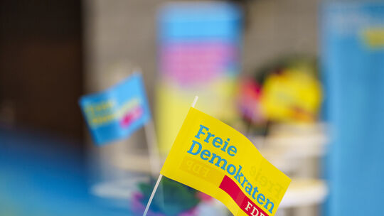 FDP-Fähnchen bei einer Wahlkampfveranstaltung Andreas Arnold. picture alliance/dpa