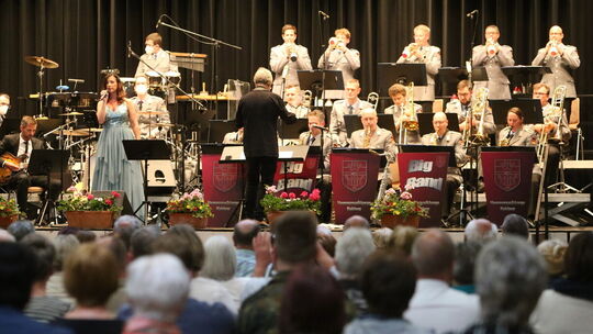In der Mülheim-Kärlicher Rheinlandhalle begeisterte die Big Band des Heeresmusikkorps Koblenz mit der Gesangssolistin Christina Wickert und Prof. Claudius Valk als Dirigent und Solist mit dem Saxofon. Foto: Winfried Scholz Winfried Scholz